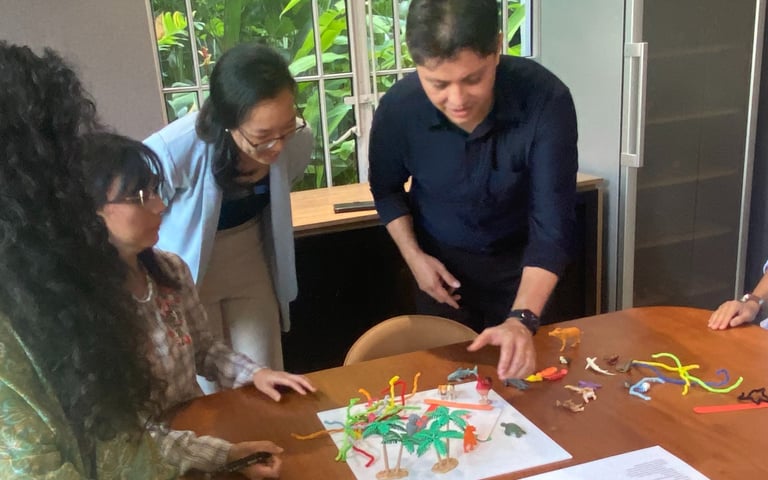 3D Mapping is a hands-on way for small groups to make sense of complex situations together. Participants co-create a physical model of a system, using objects to represent people, forces, and relationships. By moving around the model and viewing it from different angles, the group can explore how the system works — and where it might shift.